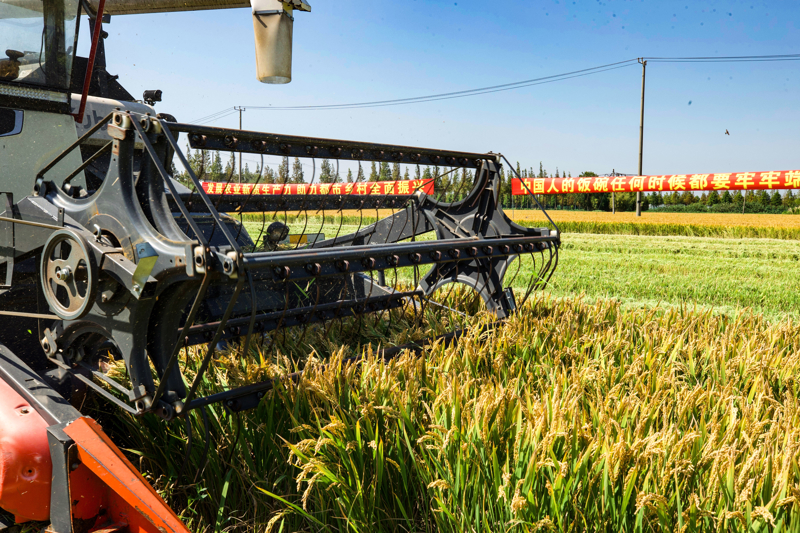 2025年8月22日在金山廊下,收割机在收割“八月香”。八月香作为今年首个开镰收割的节水抗旱稻品种,拉开了上海地区秋季丰收的序幕。 解放日报记者 张海峰 摄
