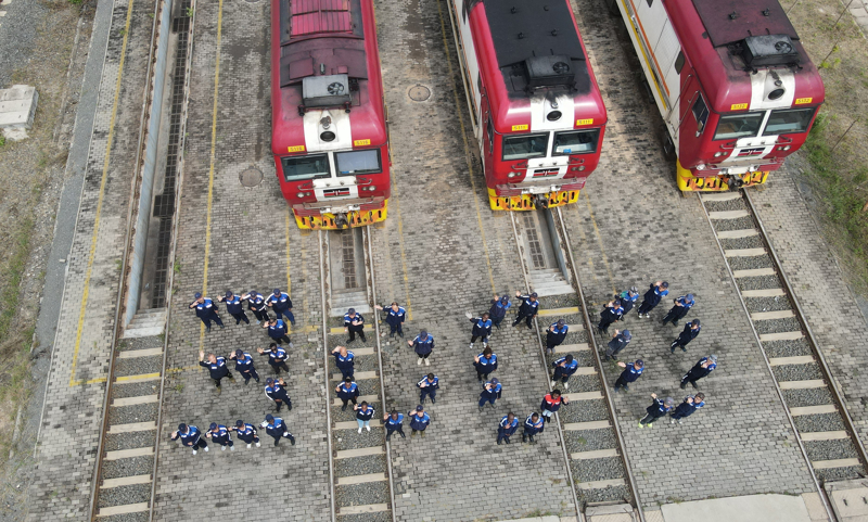 2025年8月19日,在肯尼亚内罗毕非洲之星铁路运营有限责任公司机务运转整备场,中肯两国铁路工作者在机车前站列并组成“3000”字样,以纪念蒙内铁路实现安全运营3000天(无人机照片)。\n 新华社记者 杨光 摄