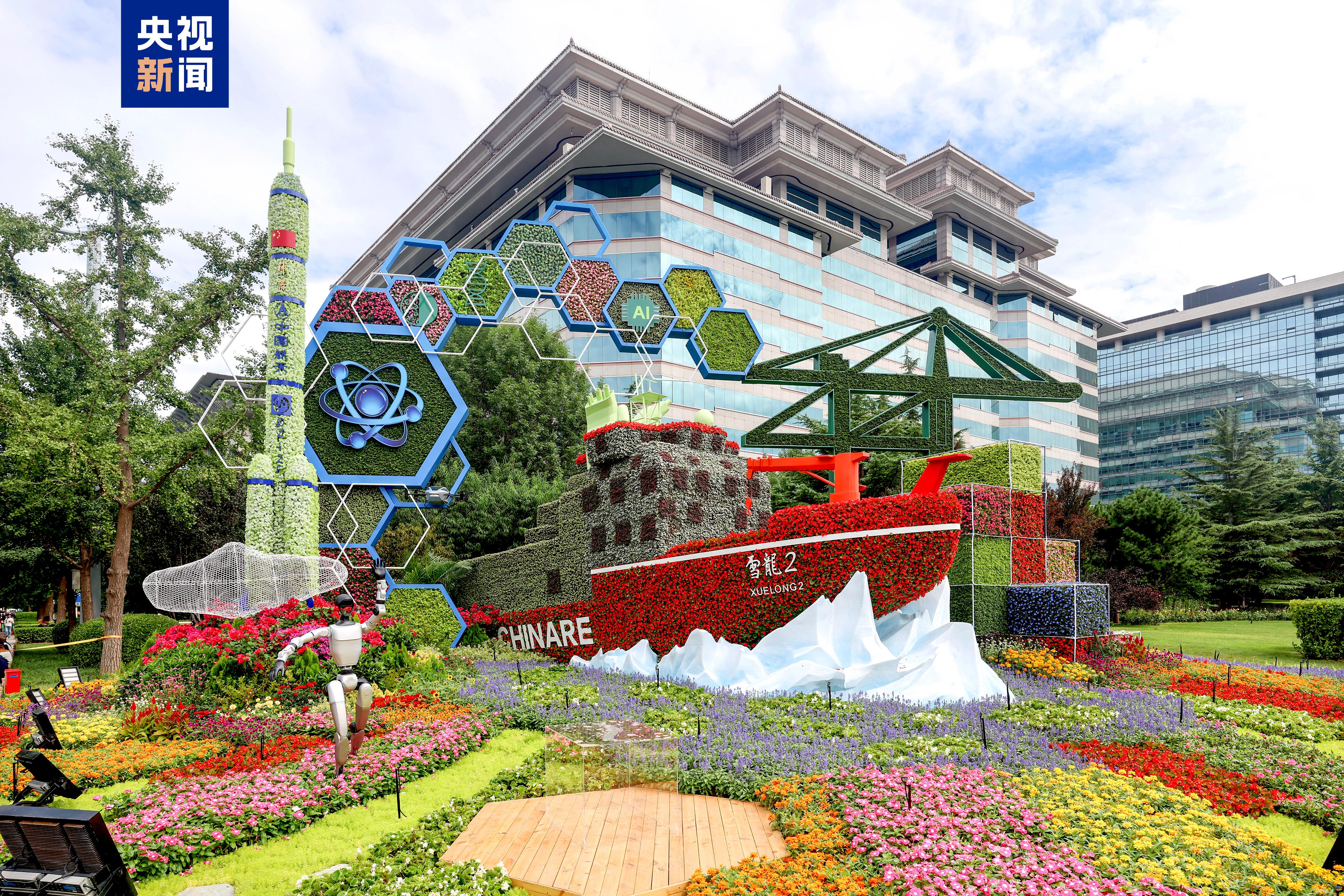 西单东南角——“科技强国”花坛以雪龙2号破冰船、神舟二十号、智能码头、机器人等为场景,展示我国在科技领域的创新成果,寓意推进高水平科技自立自强,朝着建成科技强国的宏伟目标奋勇前进。
