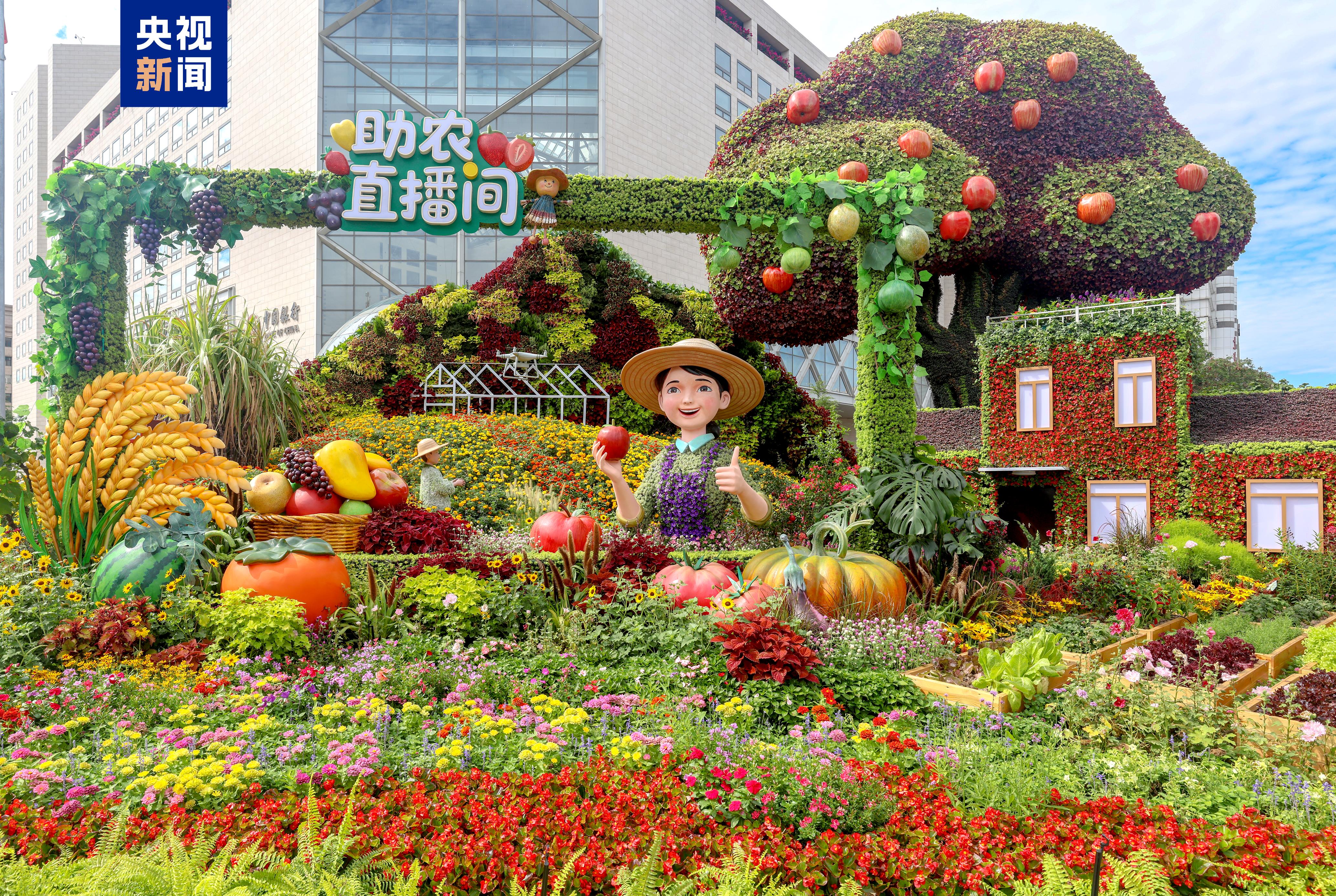 西单西北角——“乡村振兴”花坛以喜庆丰收的花园式新农村幸福生活为场景,谱写生态宜居、和谐稳定、群众安居乐业的中国特色社会主义乡村振兴新篇章。